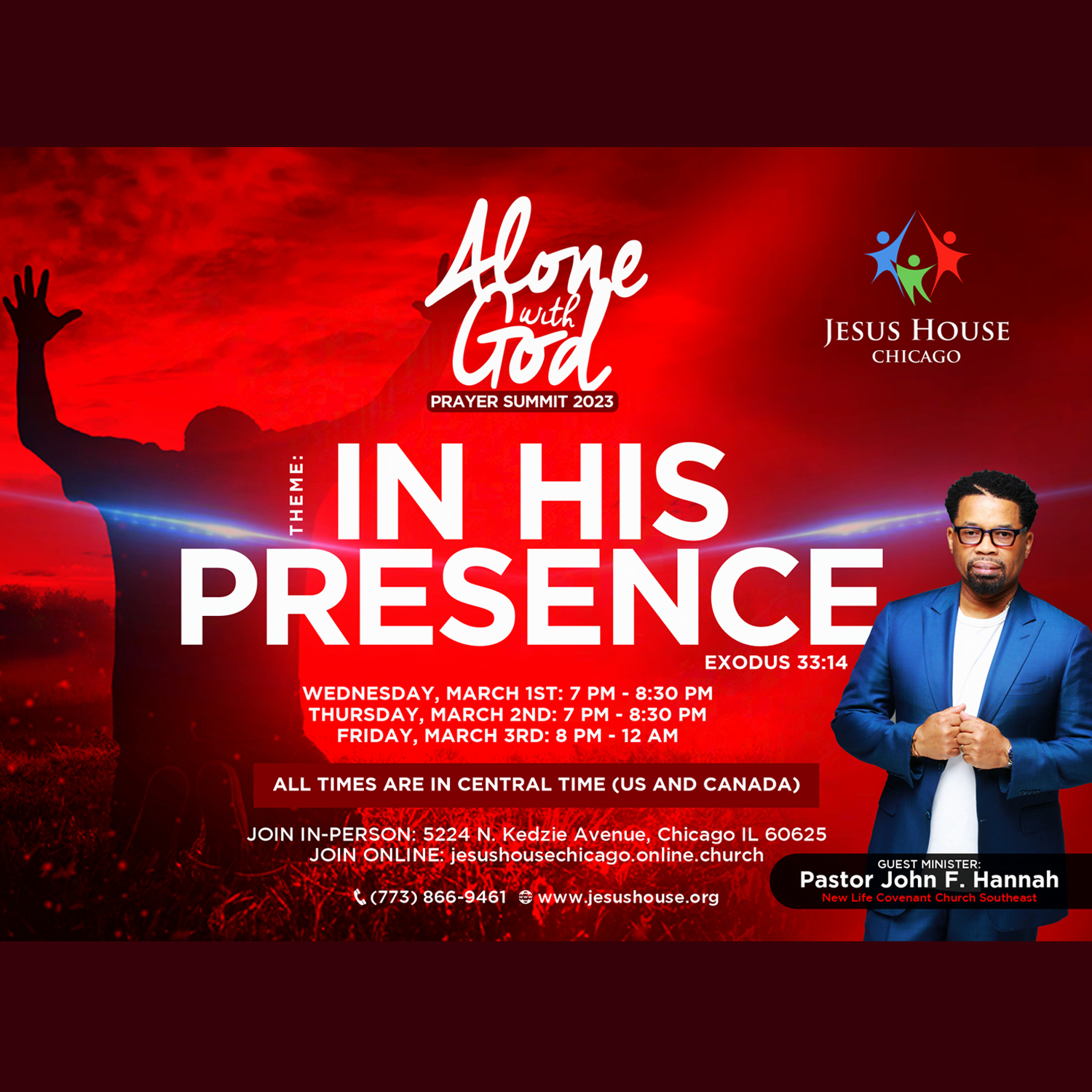 Alone with God 2023 will be live in person, at Jesus House Chicago and our Online platform. We invite you to come and join us for this unforgettable time of retreat, where you will have the opportunity to experience God’s presence and power in your life. Get ready to take your relationship with God to new heights. We look forward to experiencing God’s presence with you through this Alone with God winter prayer summit.
